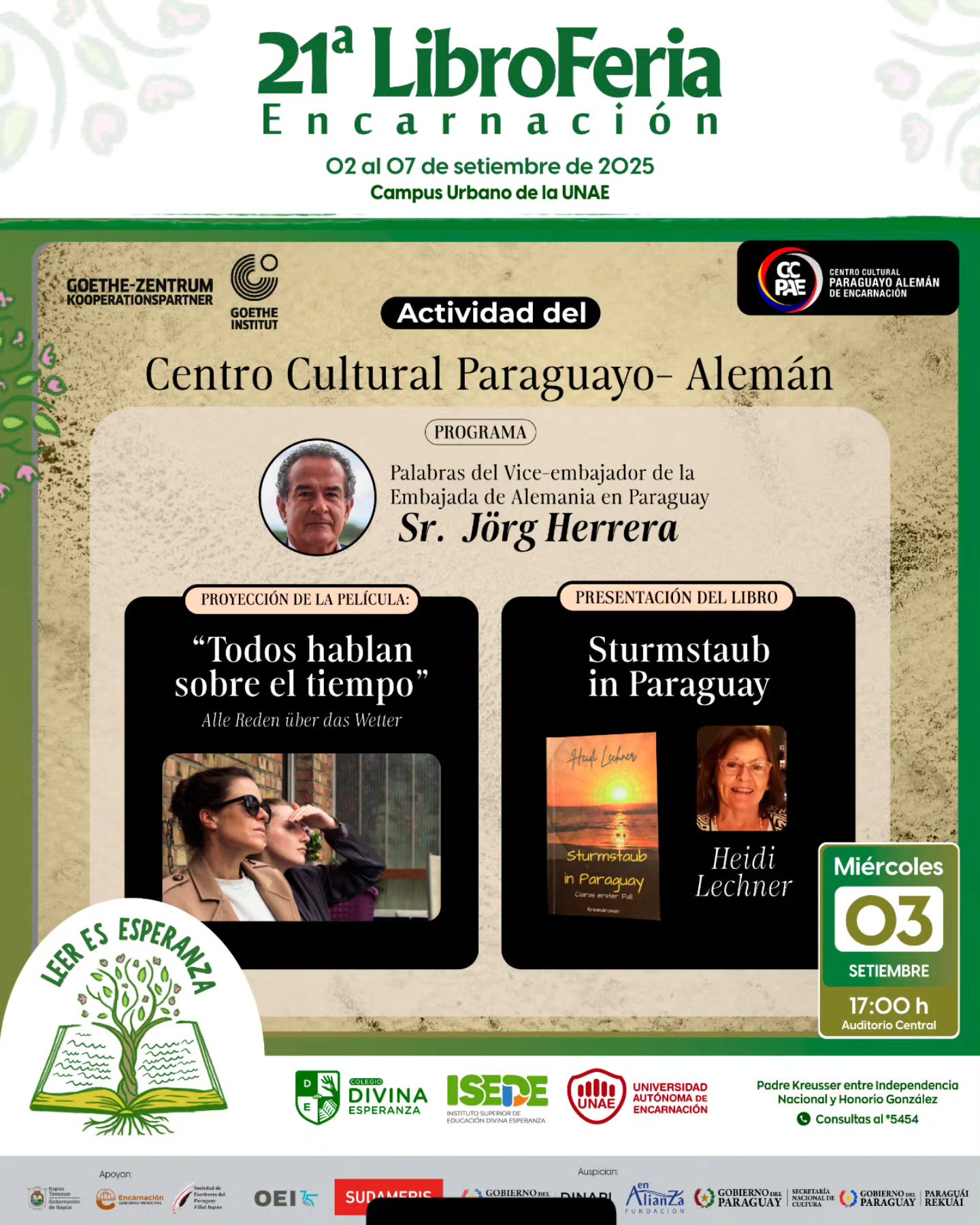 El Centro Cultural Paraguayo Alemán de Encarnación, tiene el honor de invitarle a participar de una actividad especial en el marco de la 21ª Libro Feria Encarnación, a realizarse el día miércoles 3 de septiembre de 2025, a las 17:00 horas, en el Auditorio Central del Campus Urbano de la Universidad Autónoma de Encarnación (UNAE). Acceso libre y gratuito